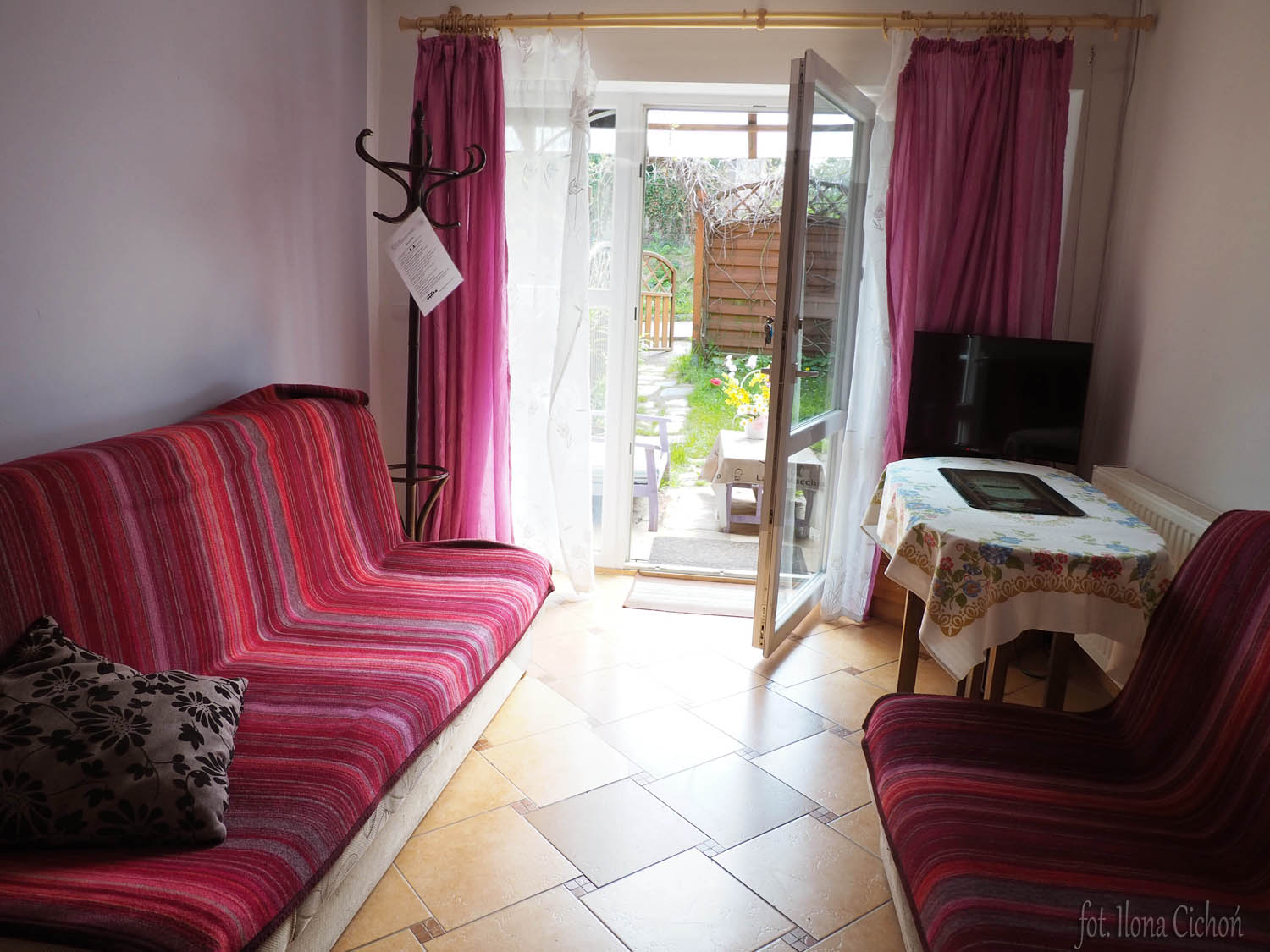 Apartament lawendowy znajduje się na parterze i składa się z dwóch pokoi (sypialni oraz salonu z aneksem kuchennym). Prowadzi do niego osobne wejście. W sypialni łoże małżeńskie, a w salonie do dyspozycji oddajemy państwu dwie rozkładane kanapy. Aneks kuchenny jest w pełni wyposażony, w apartamencie znajduje się łazienka z prysznicem oraz zadaszony taras.